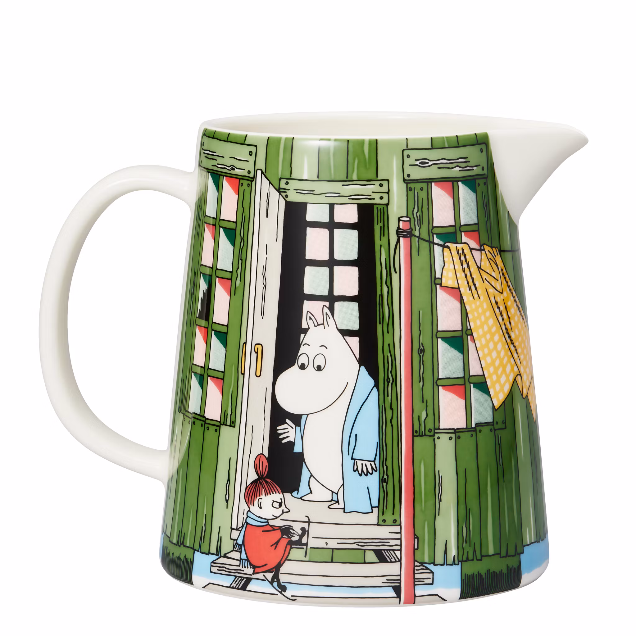 Kannan med Muminmotivet Badhuset från Arabia är en praktisk serveringskanna i vitroporslin. Det är Muminpappan själv som har byggt badhuset och det är runt, precis som Muminhuset. Det är ändå lite si och så: brädorna är olika långa och den salta luften från havet och den starka solen har fått brädorna på badhuset att blekna och redan se lite slitna ut. Men nu när vårsolen kikar fram är det dags att börja göra iordning det efter vintern igen. Ur denna Muminkanna kan du servera både varma och kalla drycker.