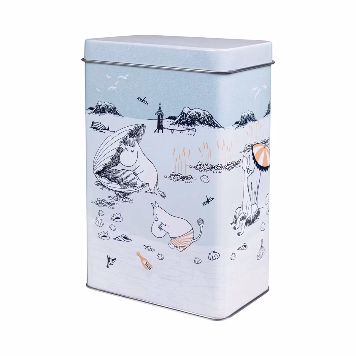 Skapa en lugn och harmonisk känsla i köket med denna vackra Mumin-kaffeburk i mjuka blå toner. Motivet visar Mumintrollet och hans vänner i ett stillsamt kustlandskap, där havet möter naturen och vardagen får sakta ner – en stund av ro, nyfikenhet och enkel glädje.