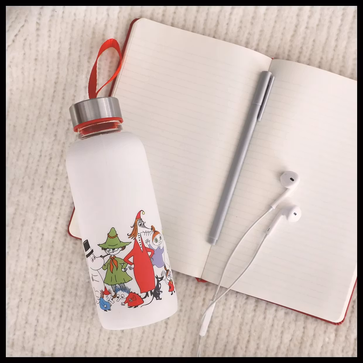 Ta med dig Muminvärlden vart du än går! Denna praktiska och charmiga glasflaska med silikonskydd är prydd med älskade Muminmotiv – perfekt för dig som vill kombinera funktion med fantasi.