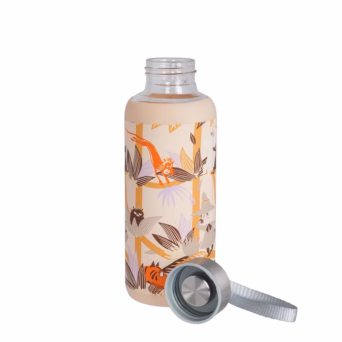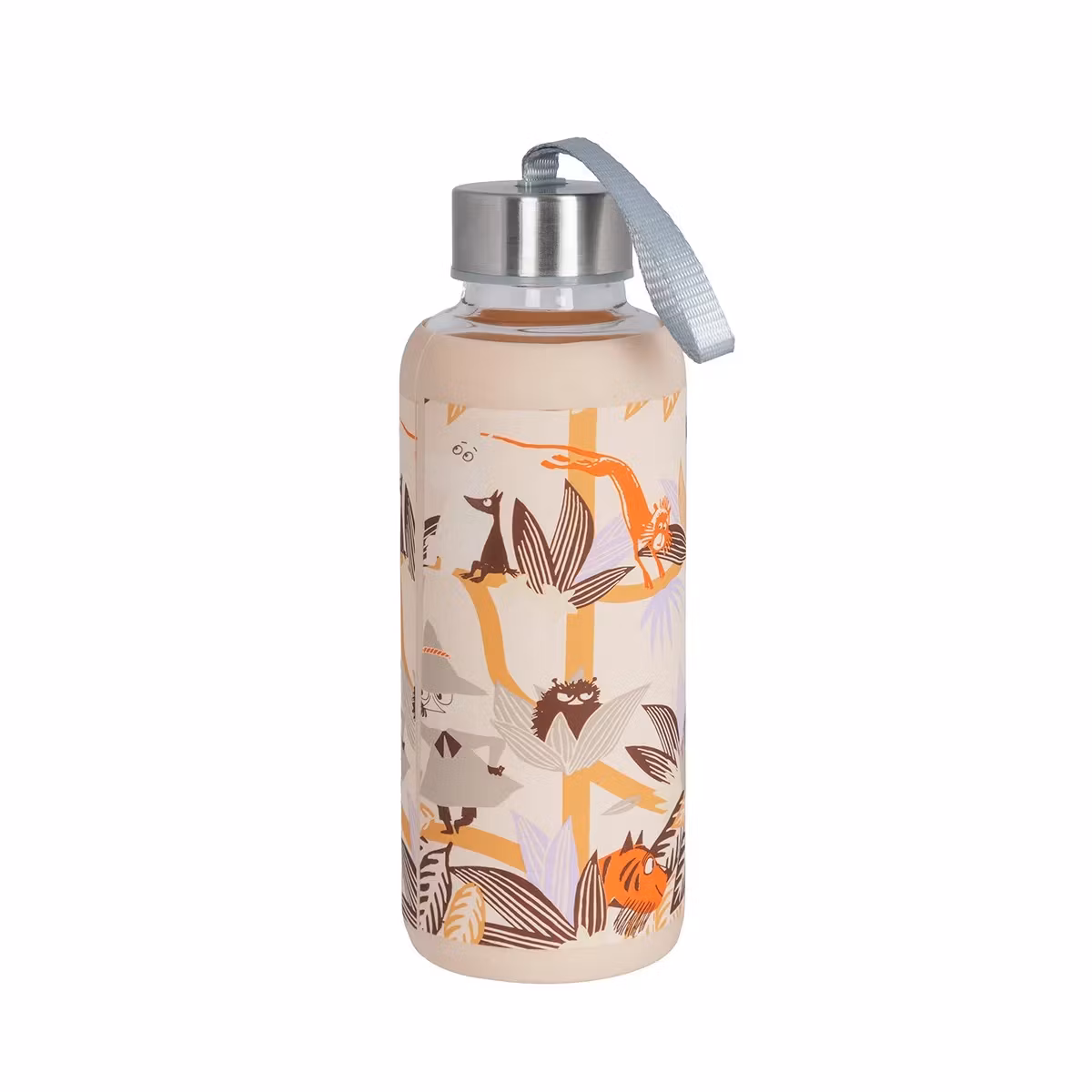 Ta med dig äventyret i vardagen med denna stilrena och praktiska glasflaska, prydd med ett charmigt Muminmotiv i varma orange toner. Muminfamiljen kikar nyfiket fram bland trädkronorna i ett sagolikt djungellandskap – en perfekt följeslagare för både små och stora utflykter!