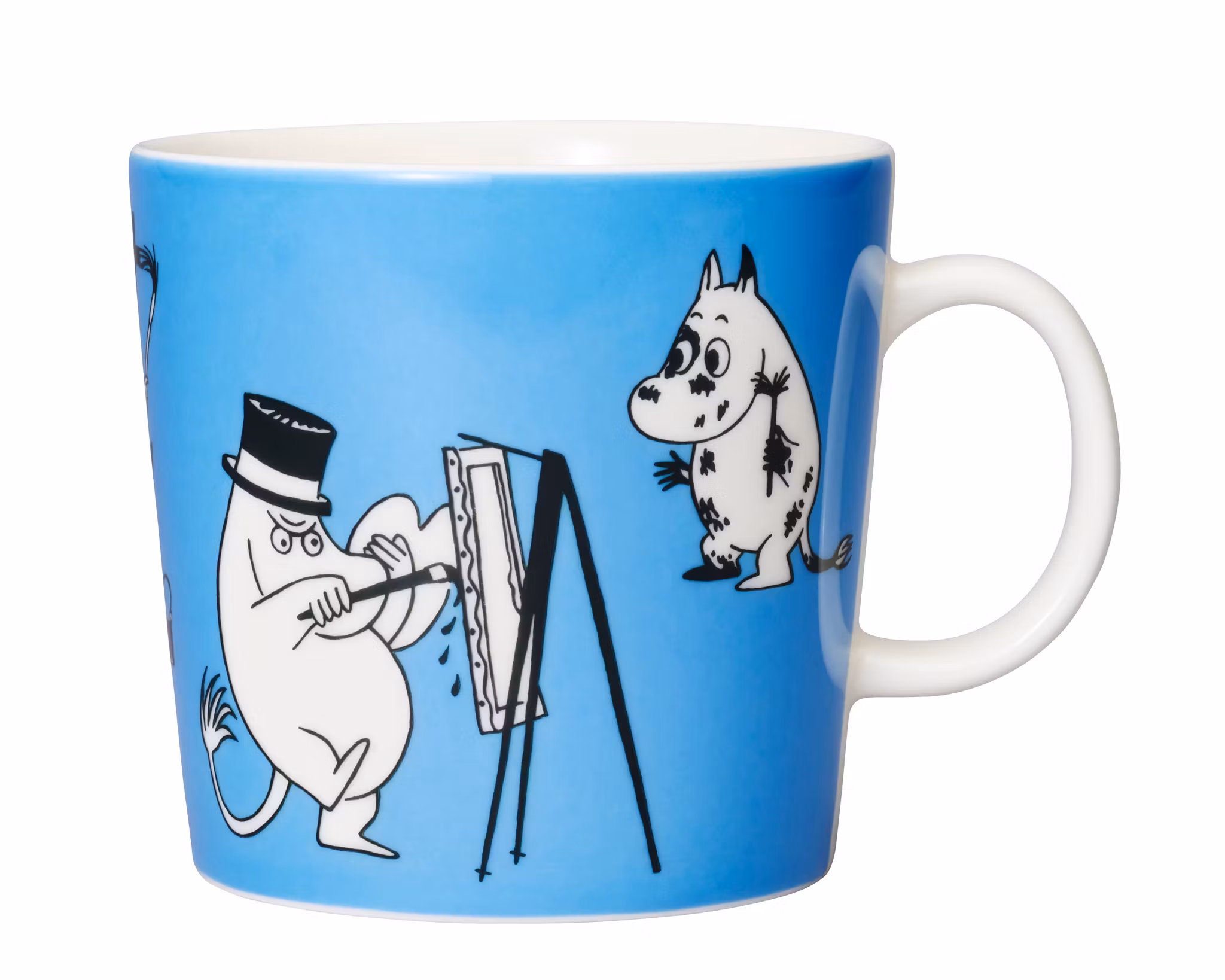 I illustrationen på muggen ser vi hela Muminfamiljen som håller på med konst. Mumintrollet gör bokstäver och han har på något vis lyckats kladda ner sig med färg. Muminmamman skapar bilder av sig själv och Muminpappan målar med oljefärger.