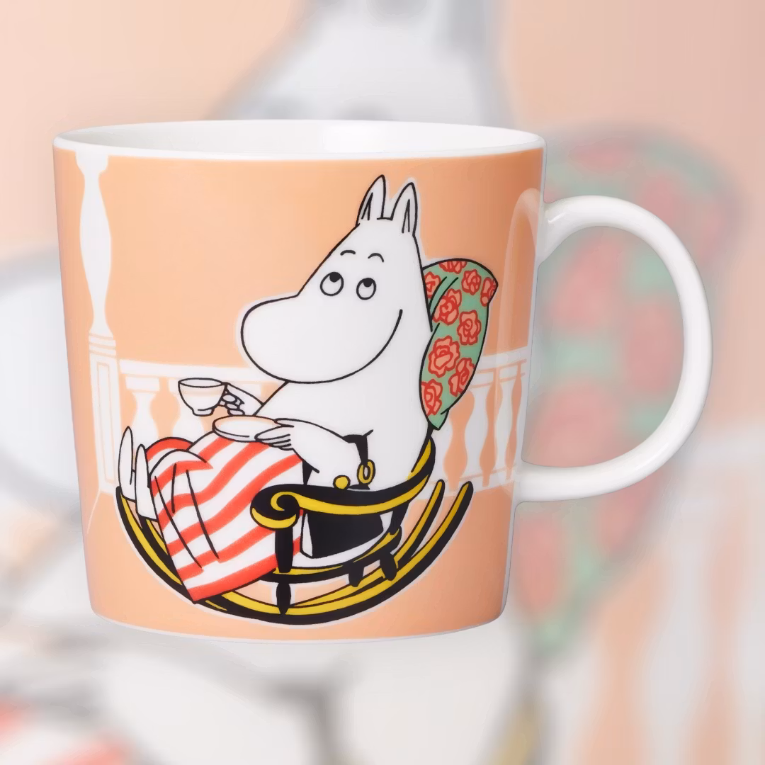 På ena sidan av muggen ser vi Muminmamman rensa i trädgårdslandet tillsammans med sitt hembiträde Misan. Anledningen till att Muminfamiljen har ett hembiträde en tid är att deras granne, Filifjonkan, tycker att Muminhuset är stökigt och att de behöver extra städhjälp. Precis som Muminmamman tar hand om andra så tar hon sig även tid för sig själv, vilket vi kan se på muggens andra sida. Där finner vi Muminmamman i en gungstol med en kopp kaffe i lugn och ro.