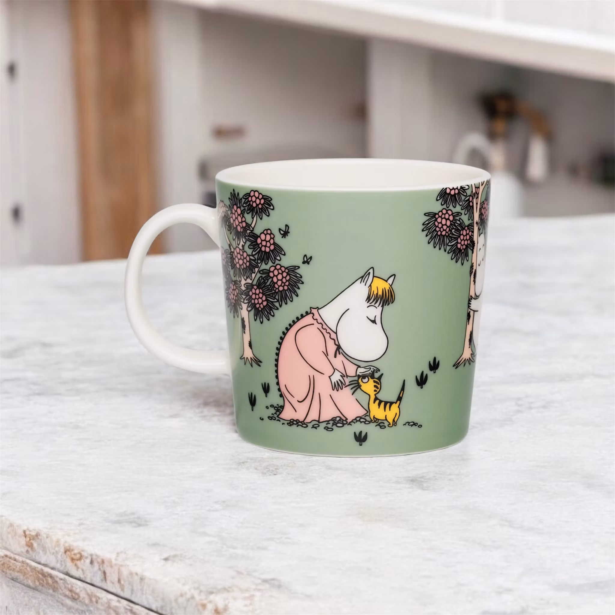 Den vackra färgskalan i mjuk salviagrön och blekrosa ramar in scener där Mumintrollet kramar ett träd, Snorkfröken klappar en katt och Muminmamman, med sin orubbligt milda natur, får även de mest skräckinjagande figurer att hjälpa till i trädgården. Varje detalj på muggen bär på en känsla av hopp och en påminnelse om hur små handlingar av godhet kan göra världen lite ljusare.