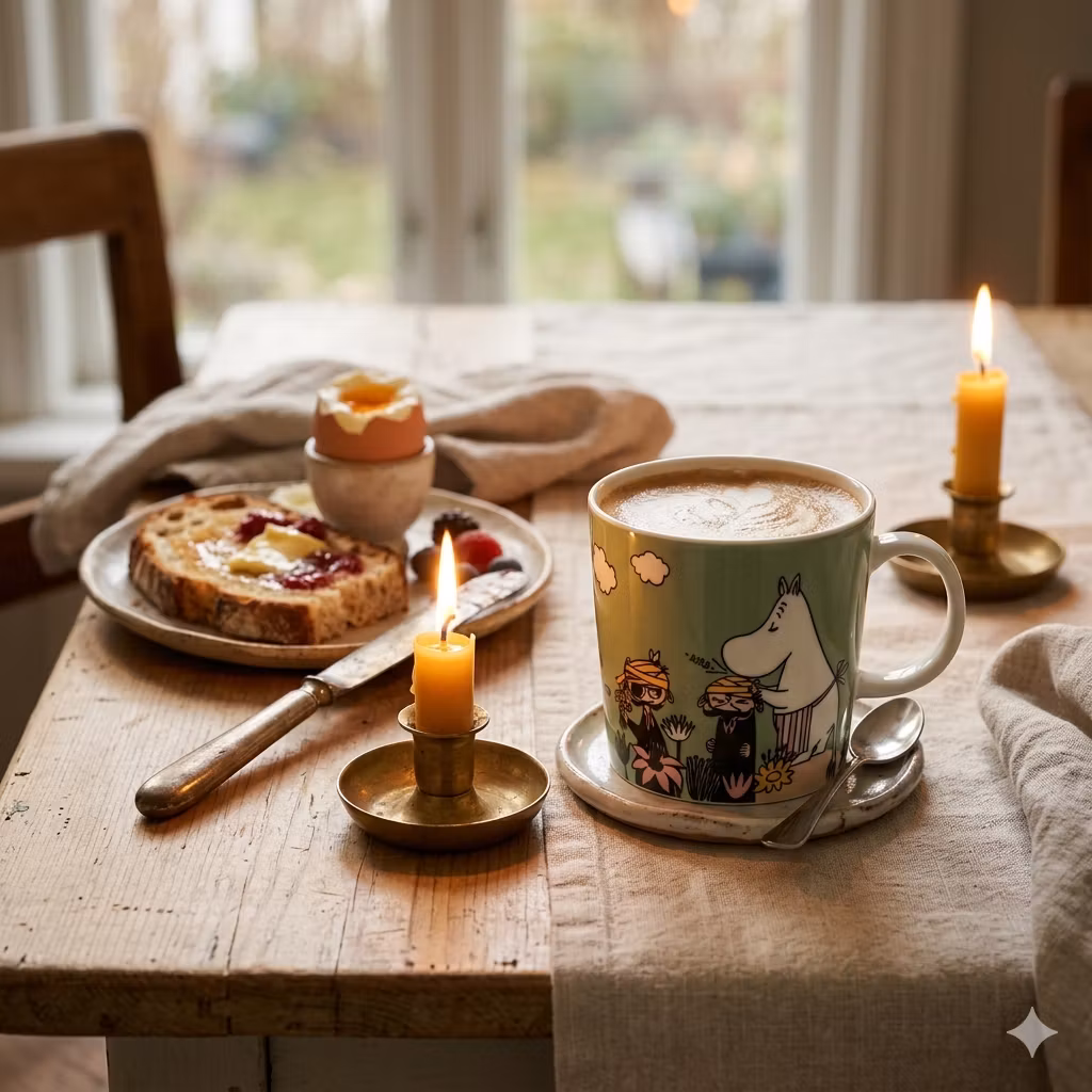 Arabia Omtanke Muminmugg fångar den varma och omtänksamma anda som genomsyrar hela Mumindalen. Här möts kärlek, mod och lekfullhet i en illustration inspirerad av Tove Janssons klassiska serier Den ensliga ön och Mumintrollet blir förälskat. Motivet skildrar hur en stillsam picknick förvandlas till ett hjärtevärmande äventyr när mumintrollen räddar skeppsbrutna pirater – en berättelse där vänlighet övervinner rädsla och där oväntade möten kan skapa nya band.